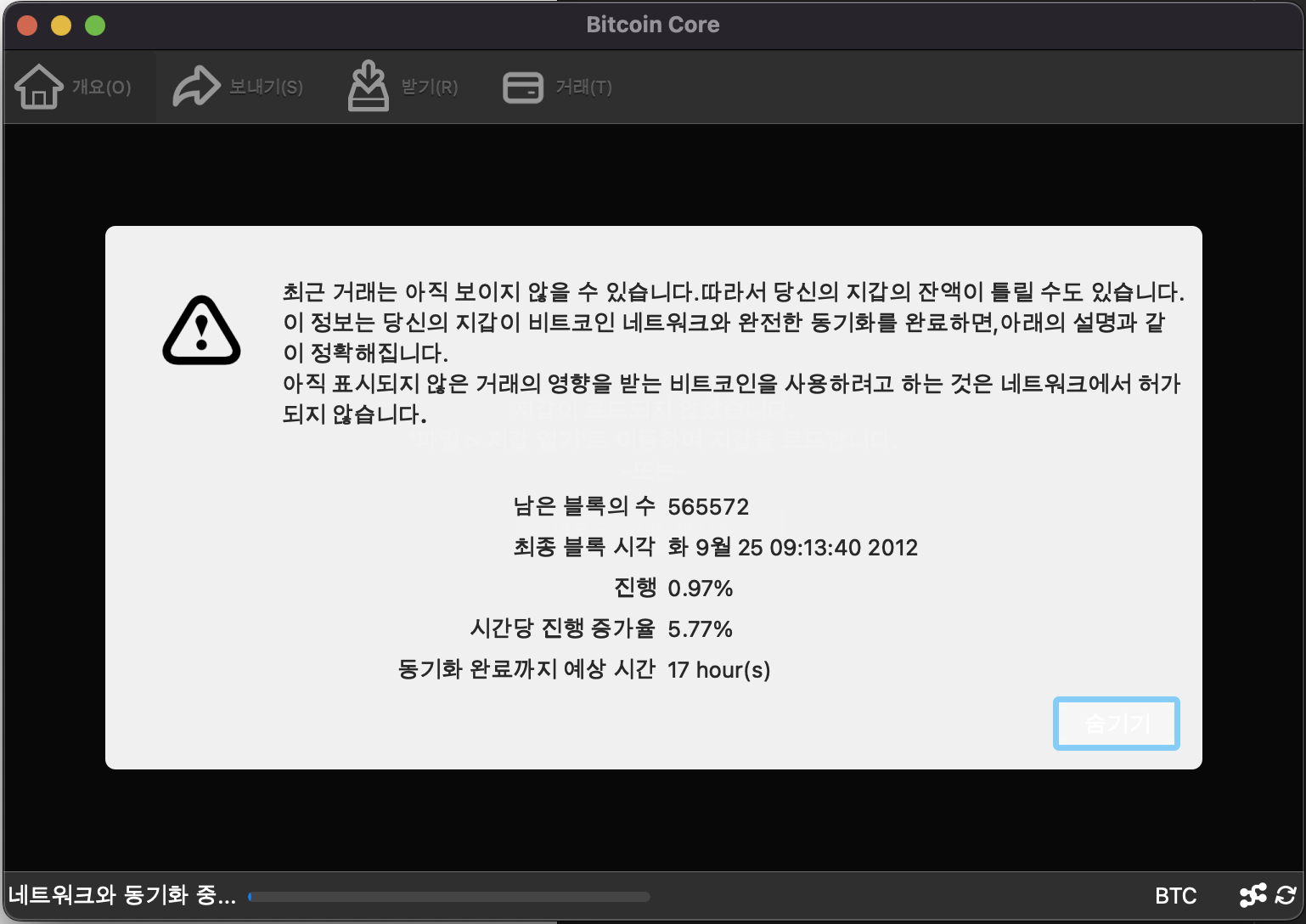 그러면 바로 블록체인 장부 동기화가 시작됩니다. 데이터 동기화까지는 개인 PC의 성능과 네트워크 상황에 따라 달라질 수 있습니다. 예상 소요시간은 진행 창에 표시가 됩니다.