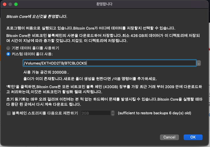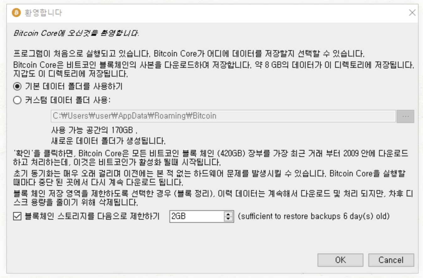 블록체인 데이터 다운로드 경로를 결정하고, 스토리지 용량 제한에 대한 옵션 결정을 마쳤으면 OK버튼을 누릅니다.