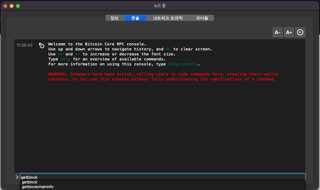 콘솔창을 통해서 다양한 비트코인 명령어들을 수행할 수 있어요