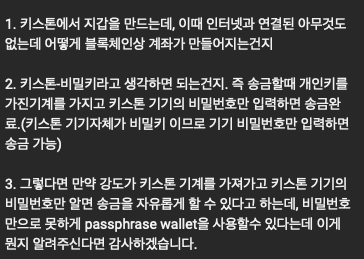 - 하지만 지갑 소유자도 패스프레이즈를 분실할 경우 해당 지갑에 접근이 불가한 것은 마찬가지겠지요.