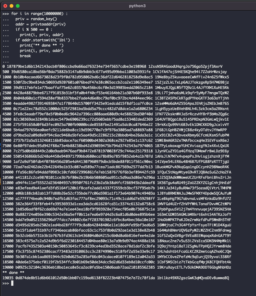 - 그러므로 루프가 20만번 정도 수행되면 원하는 비밀키와 주소를 찾을 수 있을 것으로 기대할 수 있다. 하지만 이를 보장할 수는 없다.