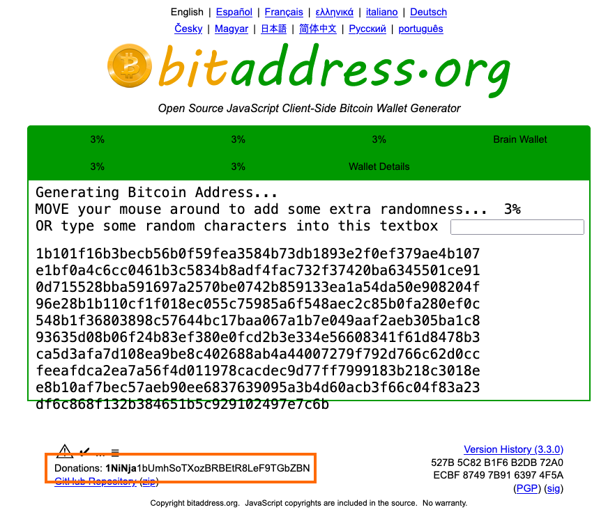 그런데 가끔 의미있는 단어를 포함하는 주소를 볼 때가 있다. 아래는 유명한 bitaddress.org 사이트의 관리자 후원 비트코인 주소이다. 재미나게? 닌자라는 단어로 주소가 시작된다.